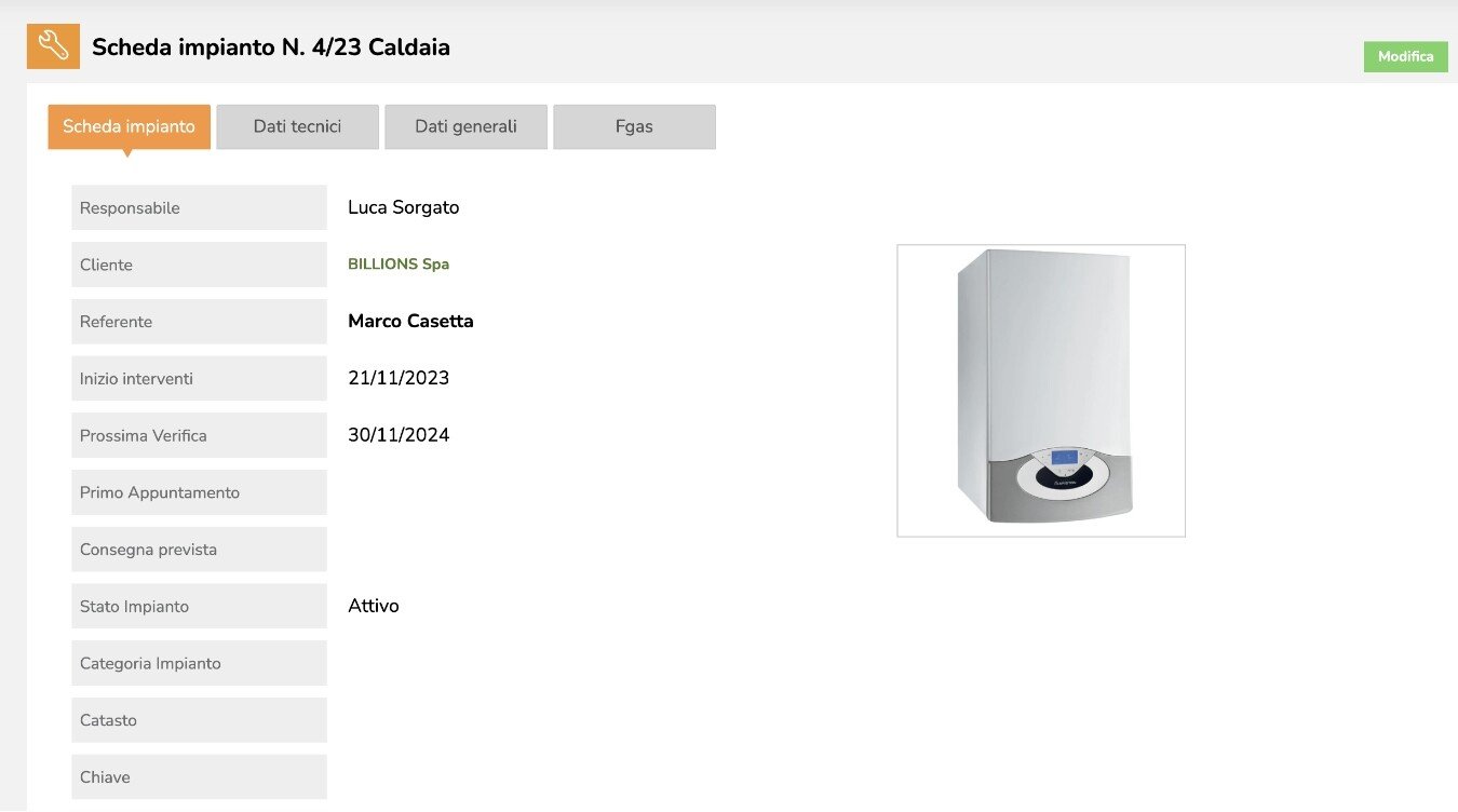 - Anagrafica completa di ogni impianto installato presso il cliente.
