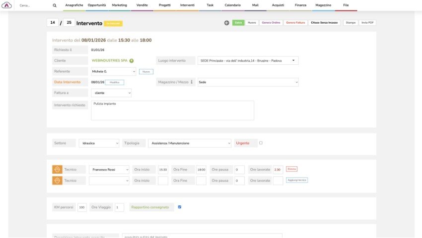 - Descrizione dettagliata dell'intervento, caricamento foto, documenti e rapportino digitale.