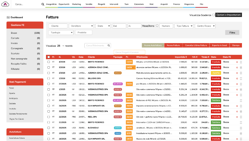 Uno scadenziario online generale e completo, inoltre, ti fornirà una visuale sintetica delle fatture in scadenza, scadute o insolute, sia in entrata che in uscita.