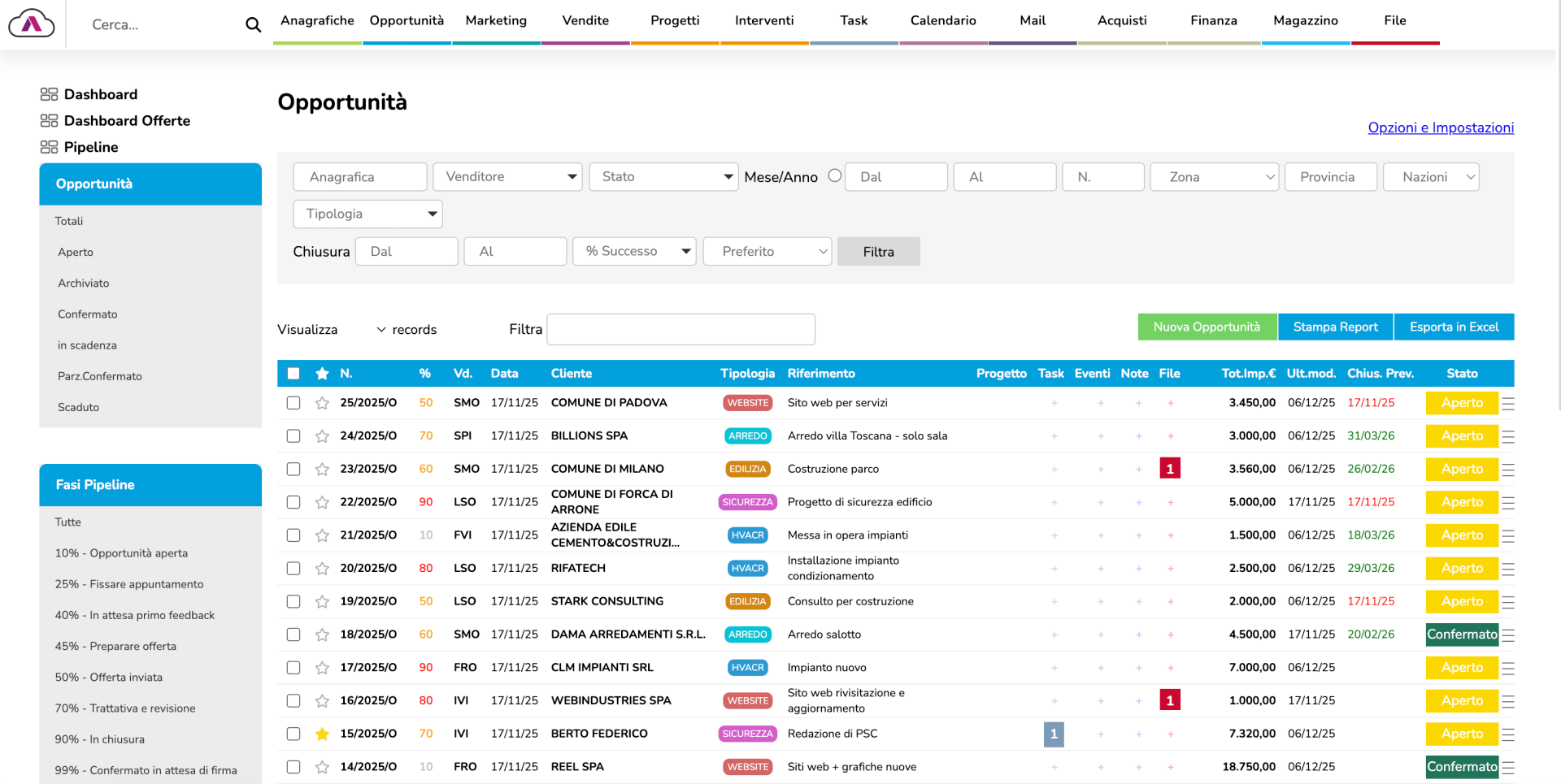 Le Opportunità rappresentano il cuore della pipeline commerciale. A differenza delle offerte (che sono documenti formali), qui gestisci trattative in evoluzione con informazioni strategiche: tipologia di progetto, referente interno, fase pipeline (0% - Presa o Archivio, 20% - Fissare call o demo, 40% - Archiviazione specifiche, ecc.), percentuale di successo stimata. Puoi filtrare per venditore, zona geografica, provincia, stato o tipologia e vedere immediatamente quali deal stanno avanzando e quali richiedono attenzione.