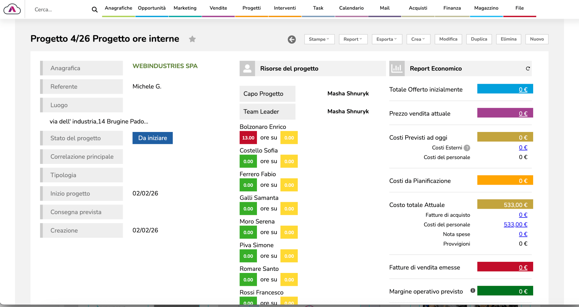 "Apri il progetto e in 5 secondi sai esattamente dove sei: margine, scadenze, chi sta lavorando, cosa manca da fare. Non devi cercare informazioni sparse in 10 posti diversi."