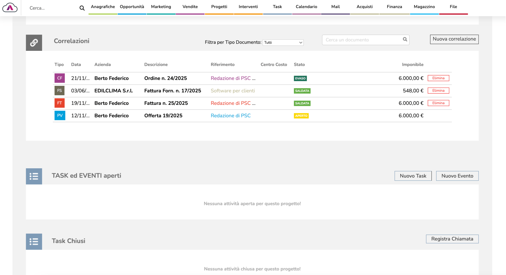 Il sistema di Correlazioni mantiene la mappa completa delle relazioni tra tutte le entità aziendali. Dalla scheda progetto vedi: quale cliente lo ha commissionato, quale lead ha generato il primo contatto, quale opportunità commerciale si è trasformata in affare, quale offerta è stata accettata, quale ordine ha attivato il progetto, quali fatture sono state emesse (attive e passive). La navigazione è bidirezionale: clicchi sull'offerta e vai immediatamente al documento originale, clicchi sul cliente e vedi tutti i suoi progetti. Lo storico modifiche traccia chi ha fatto cosa e quando: audit trail completo. I collegamenti sono automatici: quando trasformi un'offerta in ordine, il sistema crea automaticamente tutte le relazioni. La vista grafo mostra visivamente l'albero delle relazioni.
