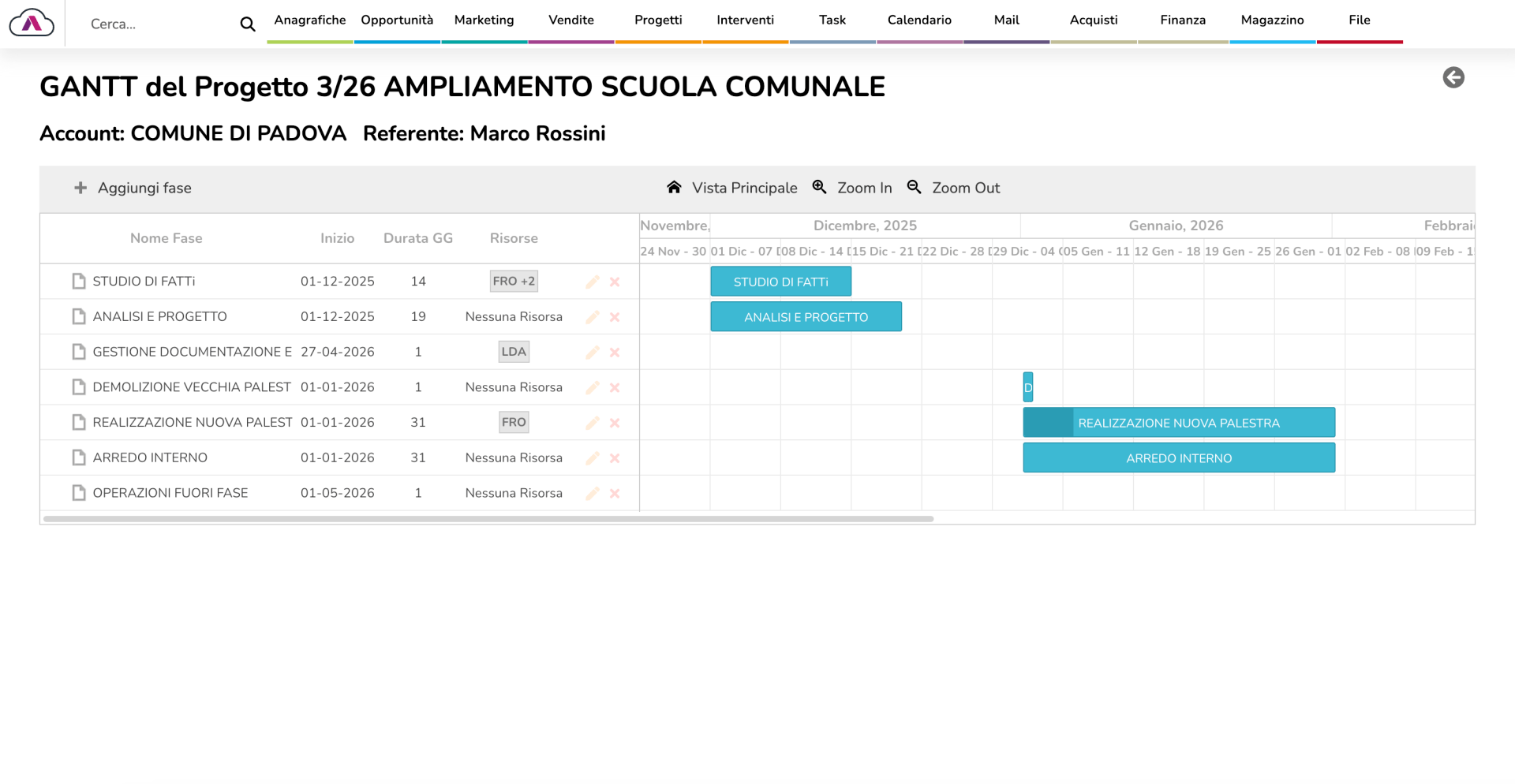 Timeline visuale del singolo progetto con tutte le fasi, task e dipendenze. Pianifica, ripianifica, esporta.